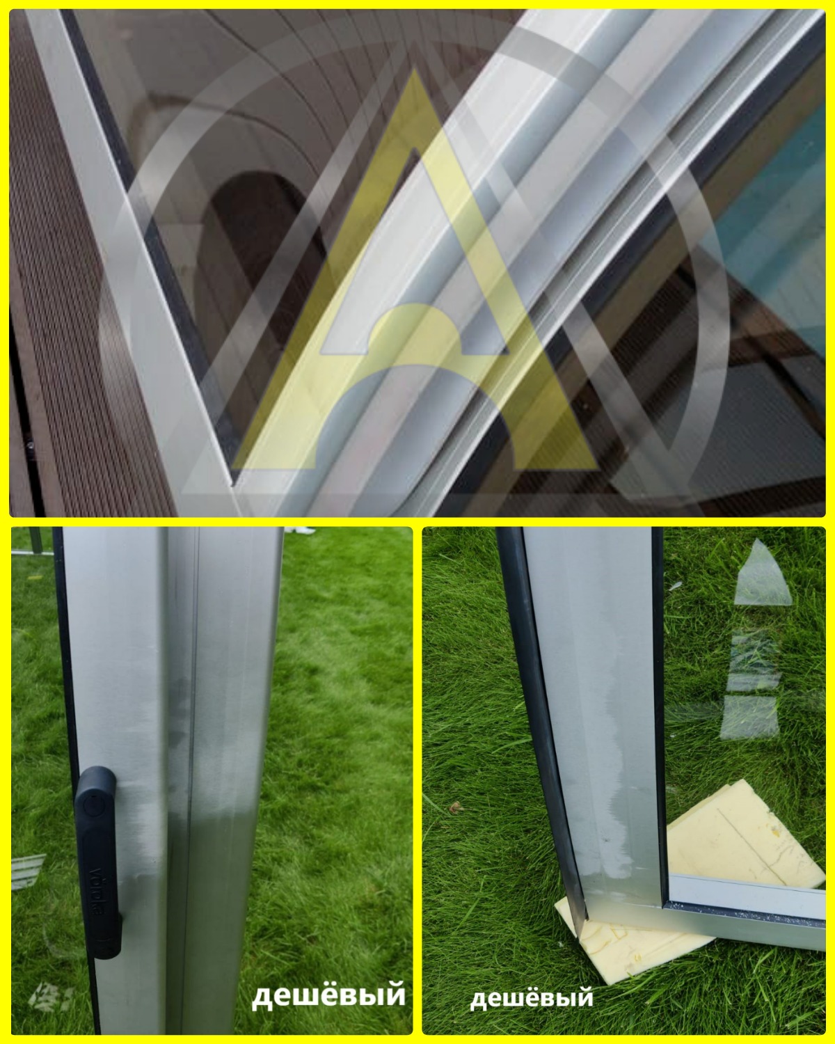 Ошибка 2. Анодированное покрытие, которое является наиболее надёжным способом защиты от коррозии, не терпит добавления вторичного алюминия. Однако другие производители при стремлении к снижению цены павильона для бассейна часто заказывают алюминиевые профиля с добавлением сырья вторичного использования (металлолома). На фото мы видим как меняется цвет анодированного покрытия в местах попадания вторичного алюминия.